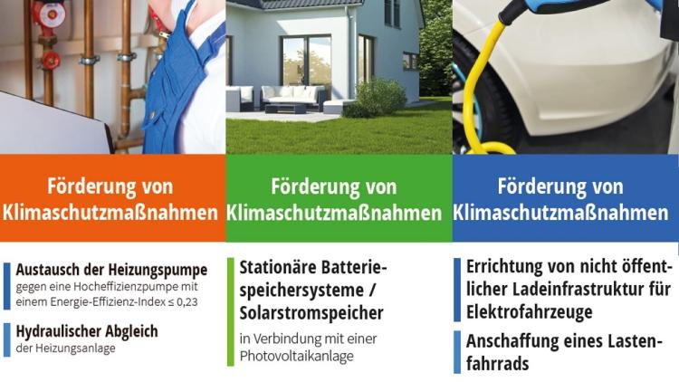 Die Gemeinde Wallenhorst fördert nun aus Klimaschutzgründen auch die Errichtung von privaten Ladestellen für Elektrofahrzeuge (300,- Euro), die Installation von Solarspeichern zur Eigennutzung aus Photovoltaikanlagen (500,- Euro) sowie die Anschaffung von Lastenfahrrädern (500,- Euro). Die bisherigen Förderungen für den Austausch der Heizungspumpe sowie für den hydraulischen Abgleich bleiben bestehen. Nicht fortgesetzt wird die Förderung des Erwerbs energieeffizienter Kühlgeräte, deren Nutzen umstritten war.